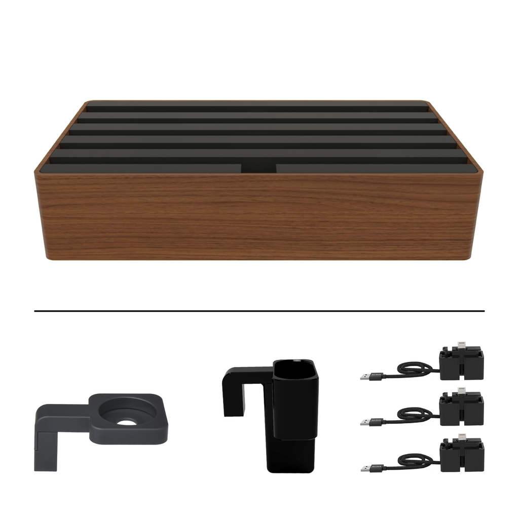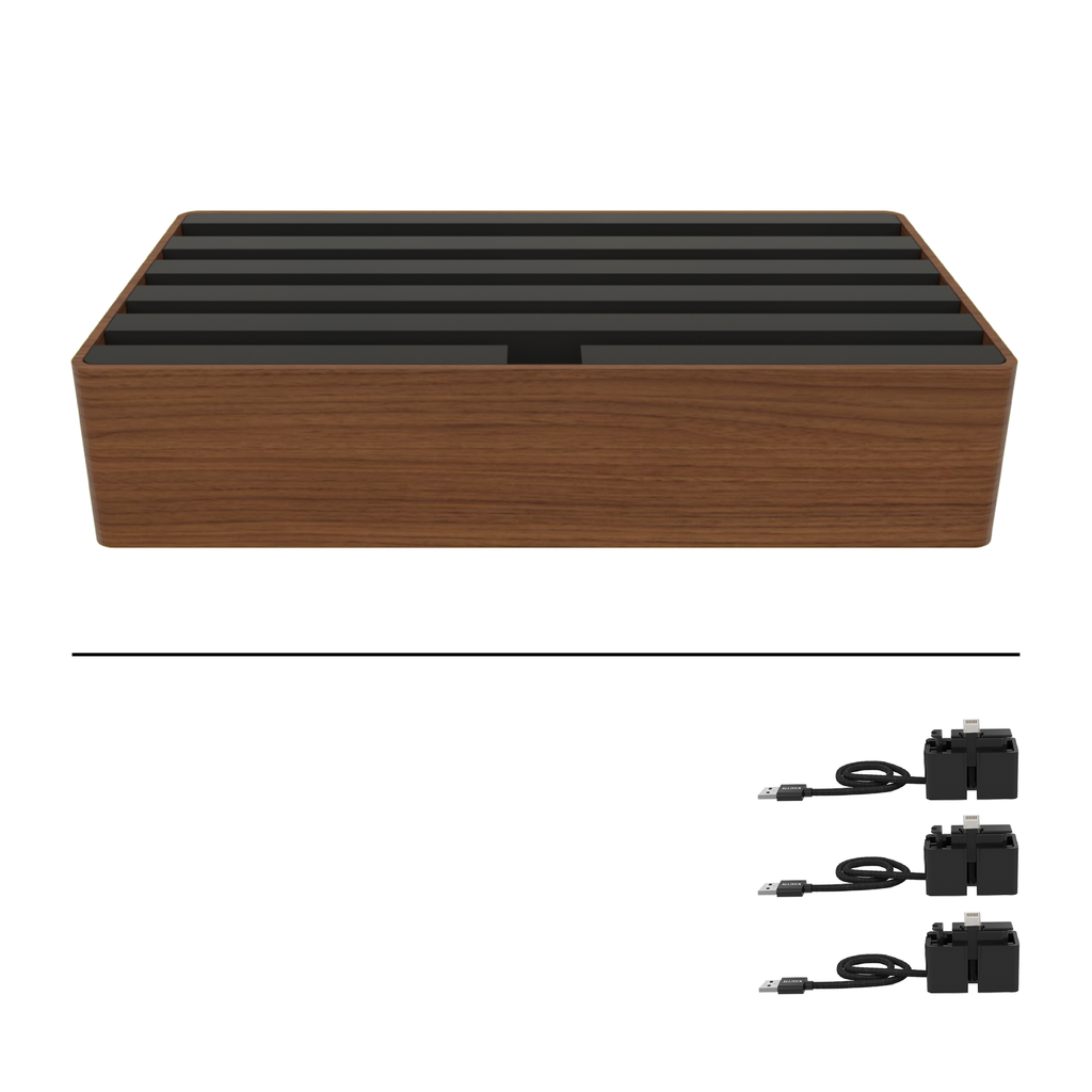 The ALLDOCK Classic Family Natural FSC Walnut & Soft to Touch Black is a charger and docking station in one. The design is timelessly beautiful and all charging cables are hidden inside the ALLDOCK. Even large tablets can be docked and charged safely. In addition, the 6-port charger can be expanded with additional charging cables.