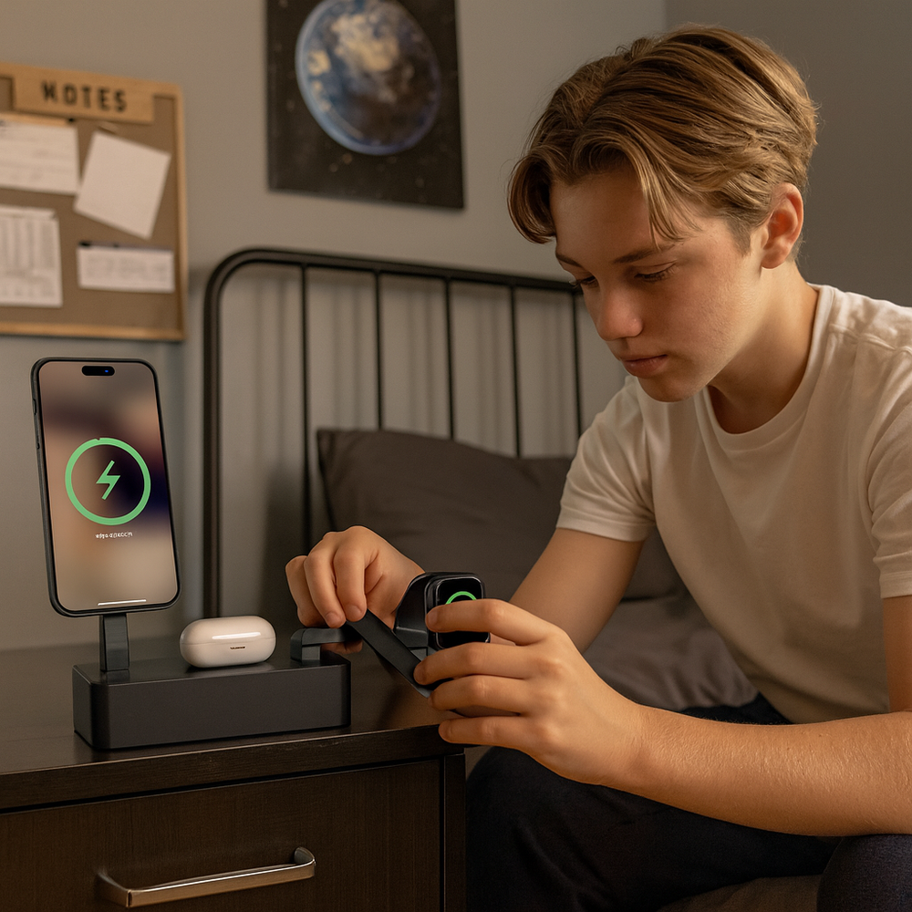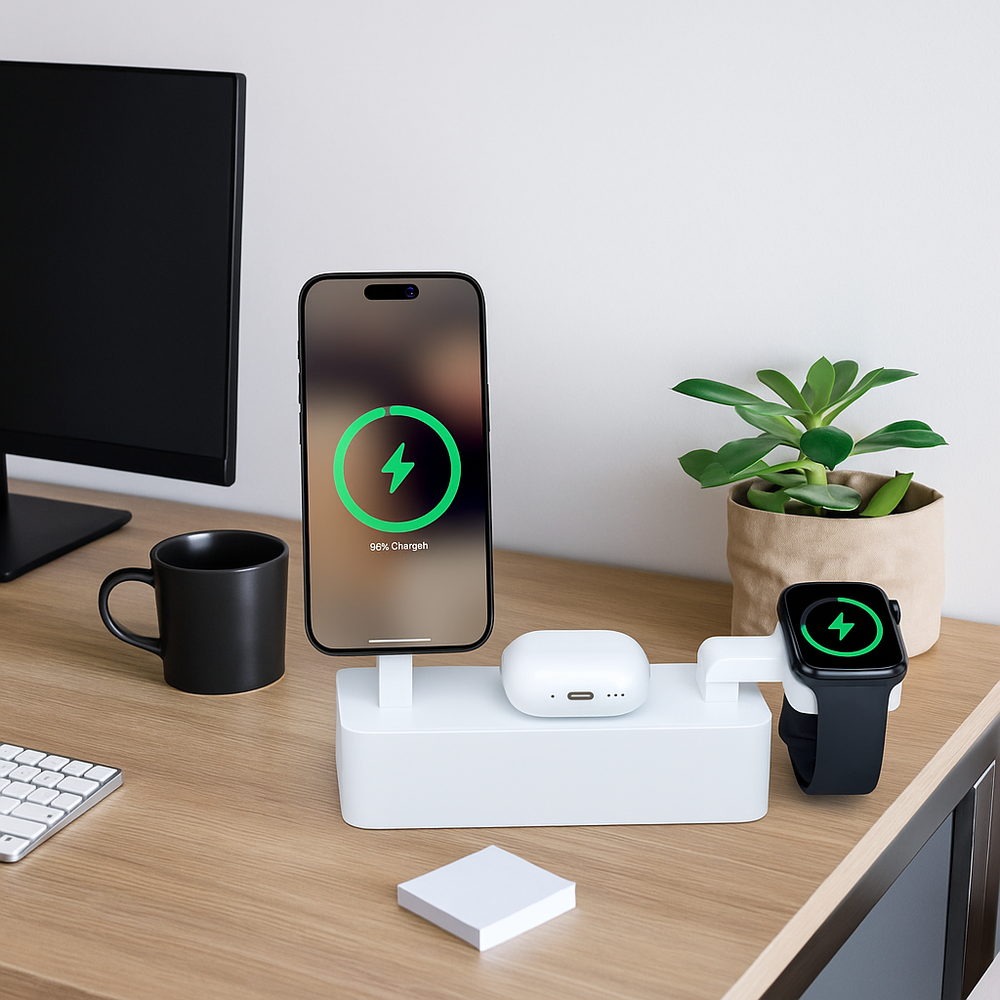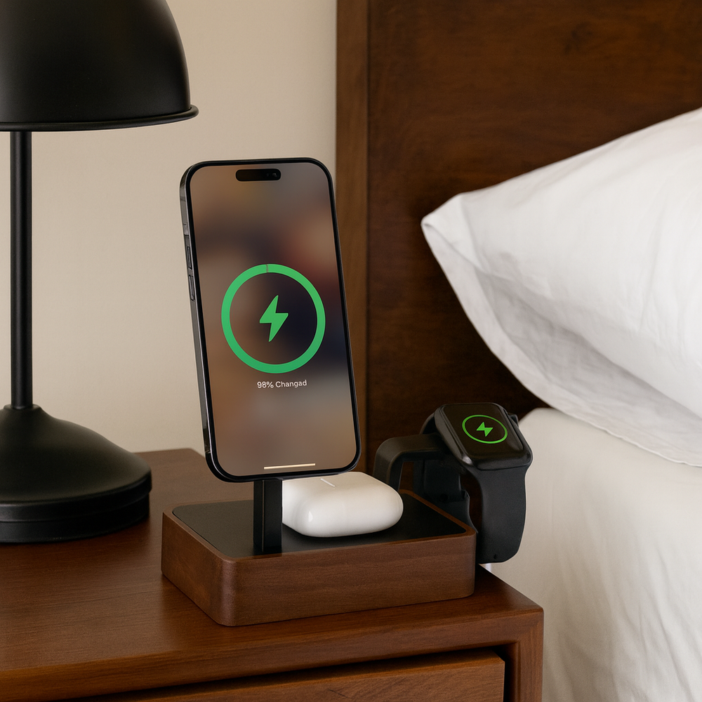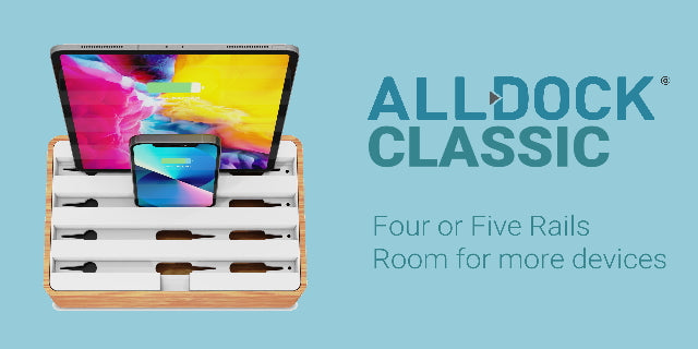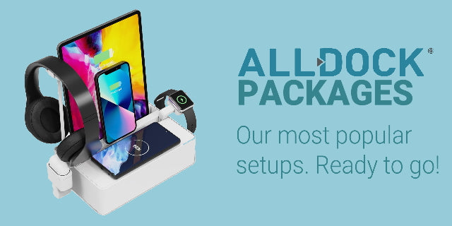 With the ALLDOCK you can charge all your electronic devices at once. Add any common charging cable (Lightning, C-Type, Micro-USB). Smartphones, tablets, digital cameras, headphones, smartwatches and Bluetooth speakers, even the Apple Pen, the Apple Mouse, all USB keyboards and the remote control of your Apple TV are compatible with the ALLDOCK charging station.